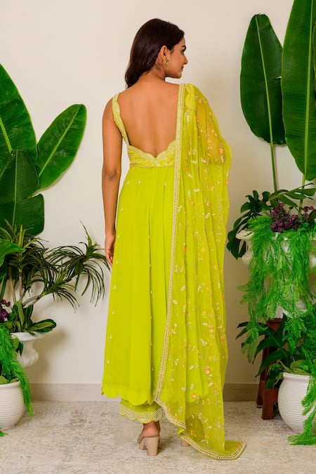 Green oasis flared kurta with pearl, zardozi, sequin embroidery on the bodice and scalloped detail neckline. Comes with straight pants and dupatta.