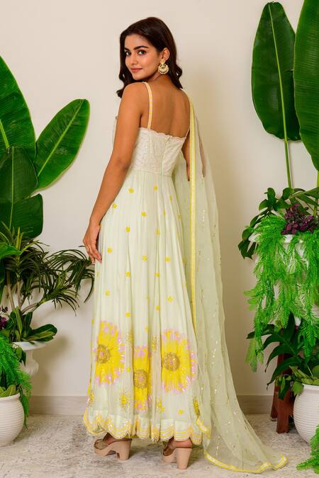 Milky green silk anarkali with sequin and beads floral embroidered motifs. Comes with pants and dupatta.