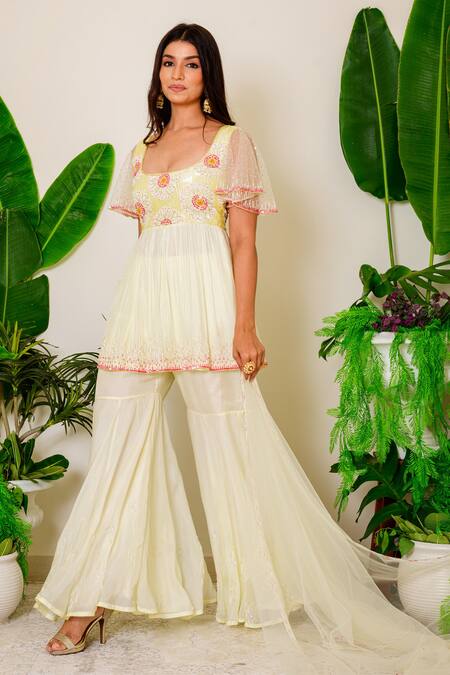 Lemon icing kurta with beads and sequin floral embroidered motifs. Comes with sharara and dupatta.