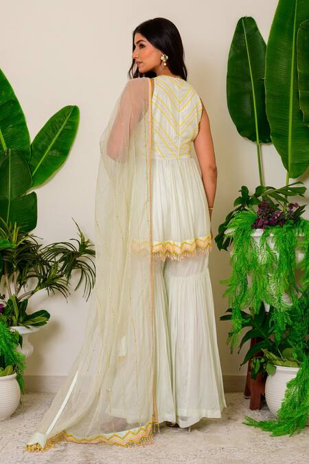 Milky green short kurta with sequin and beads floral embroidered motif. Comes with sharara and dupatta.