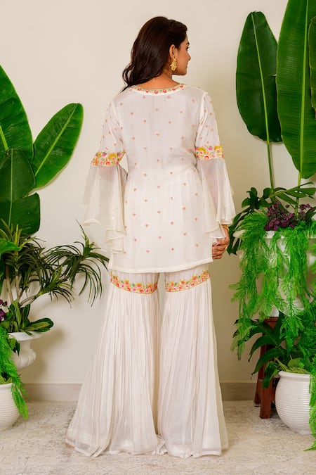 Snow white short kurta with zardozi embroidered floral motifs and flared sleeves. Comes with sharara and dupatta.