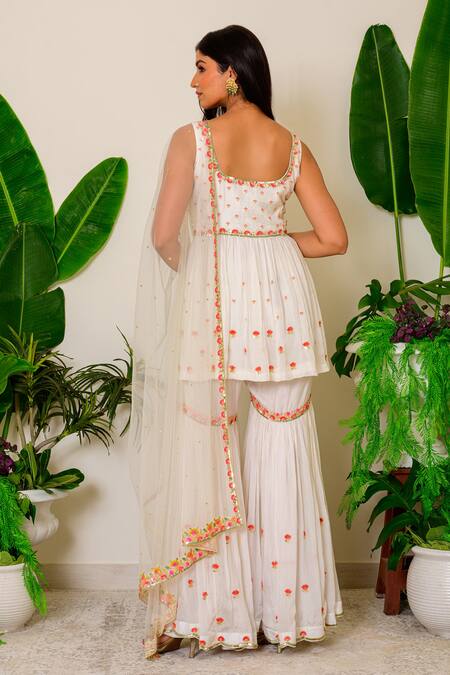 Snow white short kurta with zardozi embroidered floral motifs and flared hem. Comes with sharara and dupatta.