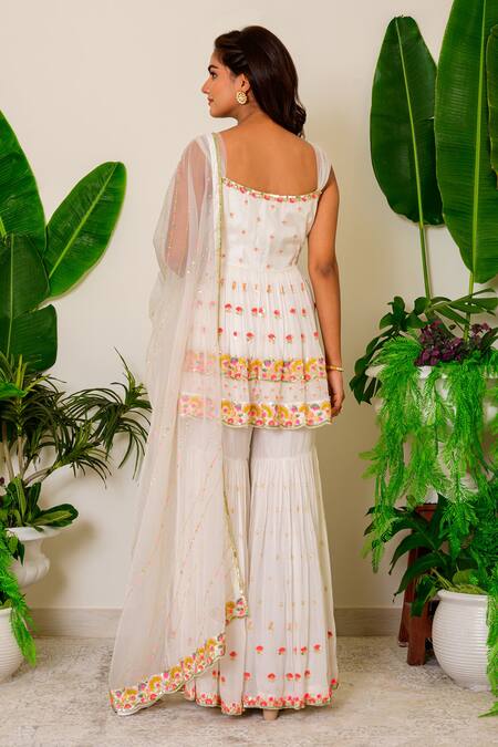 Snow white short kurta with zardozi embroidered floral motifs and flared hem. Comes with sharara and dupatta.
