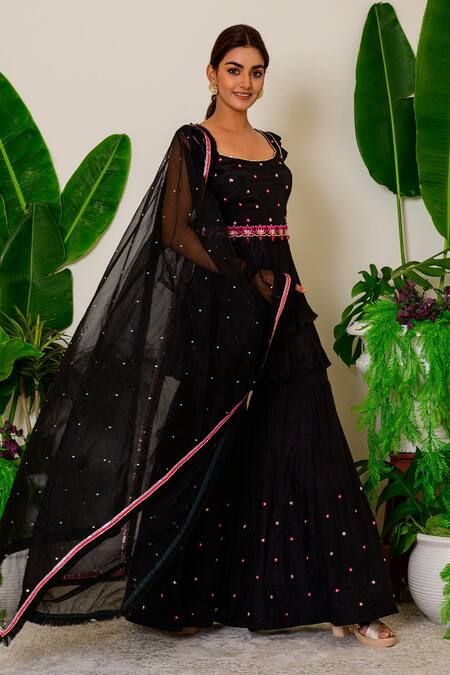 Black kurta with sequin and beads floral embroidered motifs. Comes with sharara and dupatta.