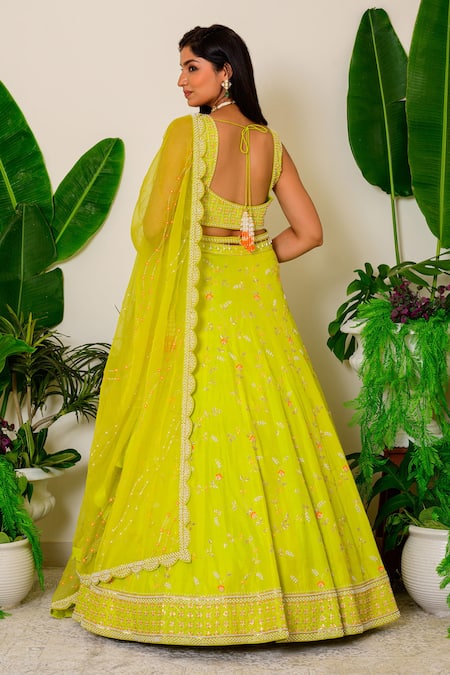 Green oasis lehenga with pearl, zardozi and sequin embroidered motifs. Comes with sleeveless blouse and dupatta.