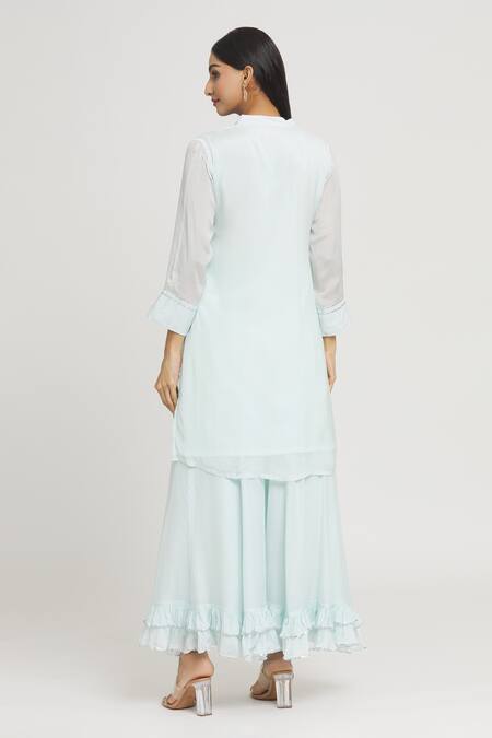 Powder blue kurta featuring a mandarin collar and three quarter sleeves with silver lace embellishment. Paired with a frill hem sharara and matching dupatta.