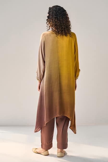 Mustard brown ombre asymmetric kurta featuring full sleeves and sequin embellishments. Paired with matching relaxed fit pants.
