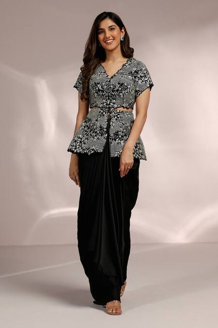 Black peplum top featuring bloom jaal embroidery and short sleeves. Paired with a solid draped skirt and a detachable drape.