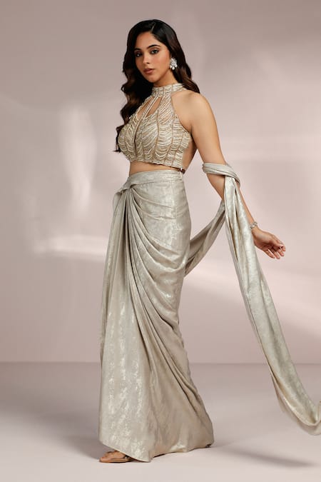 Gold halter neck blouse embellished with cutdana tassel hangings. Paired with a metallic silver solid pre-draped saree.