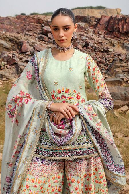 Green kurta featuring three fourth sleeves with gullista print and embroidered highlights. Paired with a matching printed gharara and a dupatta.