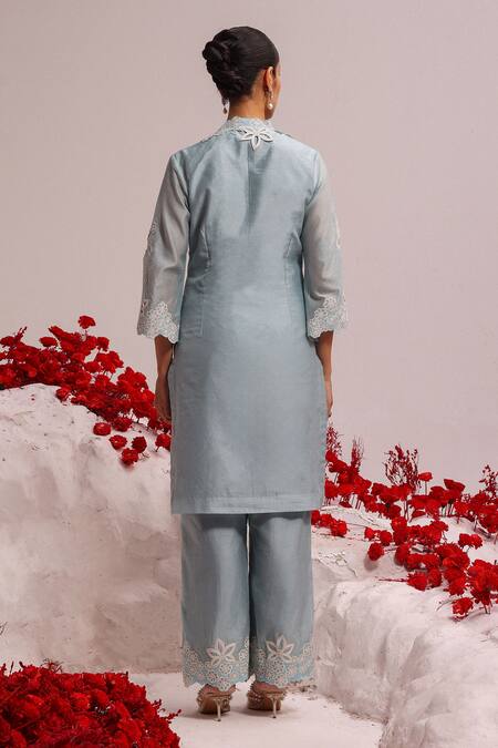 Powder blue kurta featuring resham cutwork embroidered neckline in floral pattern. Paired with matching pants that have embroidery on the hem.