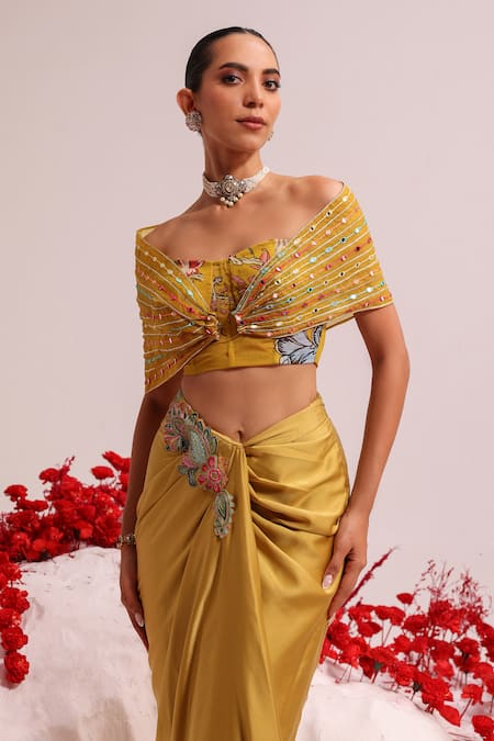 Yellow mirror and gota embroidered wrap top featuring floral prints and off-shoulder sleeves. Paired with a draped skirt adorned with paisley and floral applique details.
