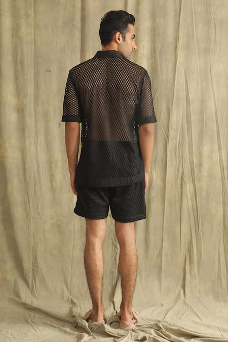 Black crochet net shirt featuring a collared neckline and half sleeves