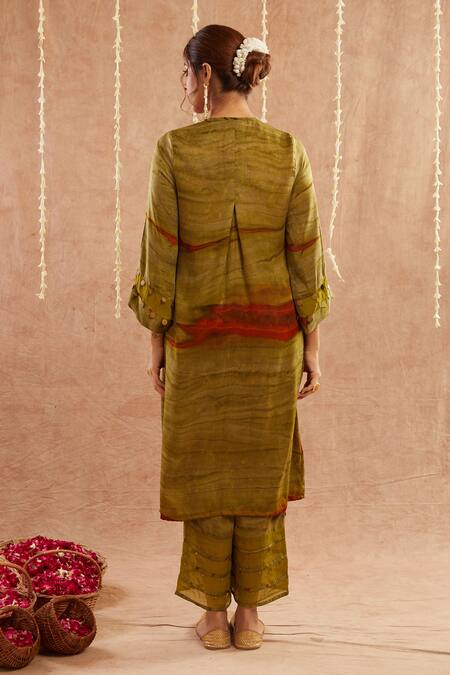 Green gathered kurta featuring coin embellishments and a mandarin collar. Paired with a matching pant, gota lace embellished dupatta, and potli bag.
