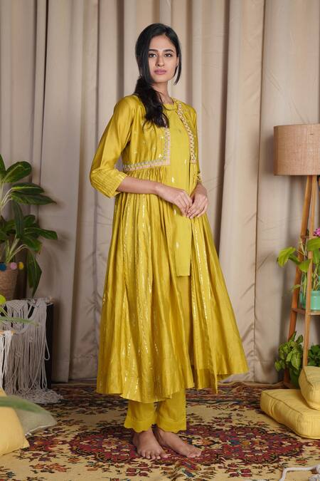Green Lurex, Chanderi Silk Round Embroidered Jacket And Kurta Set