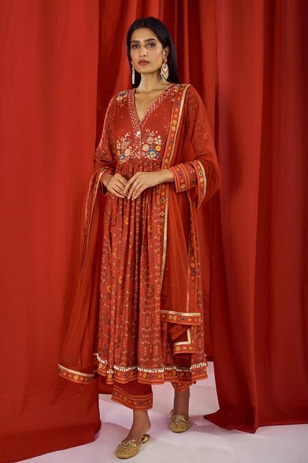 Red floral print anarkali with V neckline & mirrorwork hem. Paired with pants & sheer dupatta.