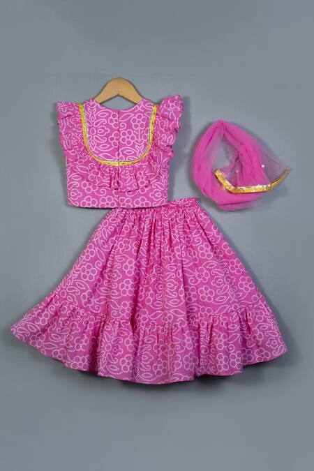 Pink bandhej lehenga featuring a flared bottom with frilly hem. Paired with a flower detailed top and dupatta.