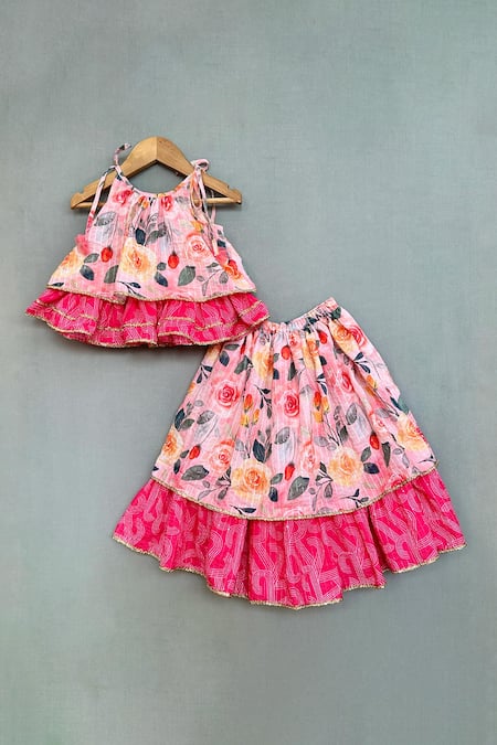 Buy_Label Neeti_Pink Cotton Blossom Print Tiered Lehenga And Top Set _at_Aza_Fashions