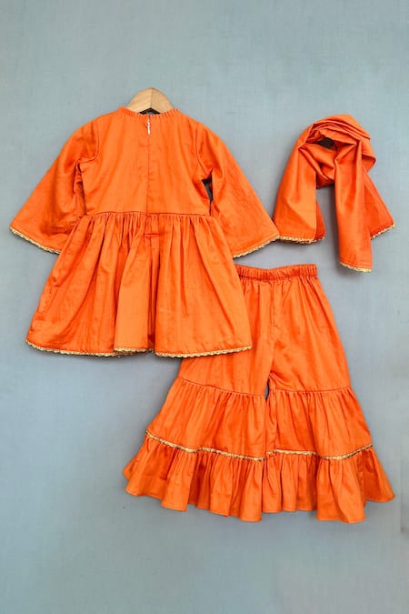 Orange peplum kurta featuring frill neck and bell sleeves with zari and bead hand embroidery on the yoke. Paired with a flared sharara and a zari lace bordered dupatta.
