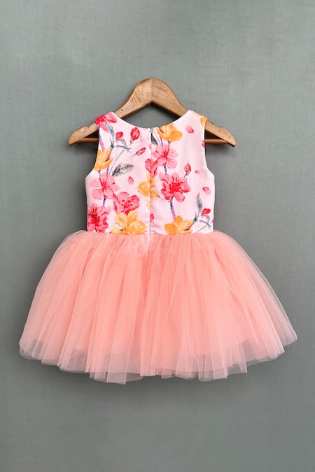 Peach Net, Linen, Cotton Bows Floral Bouquet Print Dress