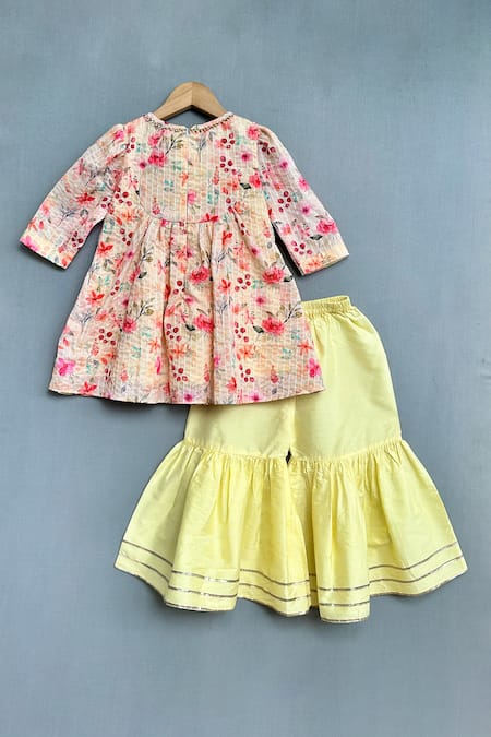 Pink kurta featuring an all-over floral print with embellishments of sequins, lace, and ghunghroo. Paired with a contrasting yellow sharara, designed for a relaxed fit.