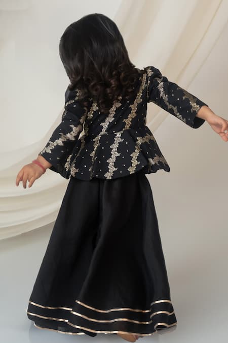 Royal black peplum blouse with floral stripe woven motifs. Paired with gota border embellished lehenga.
