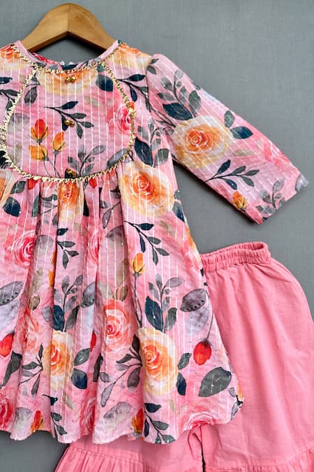 Pink kurta featuring a rosette print with sequin threadwork, lace, and ghunghroo details. Paired with a matching sharara with an elastic closure.
