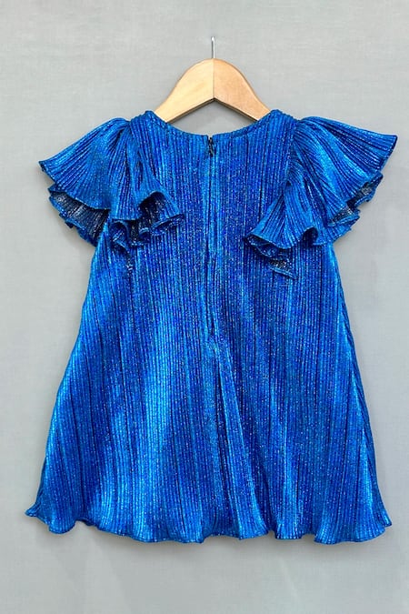 Royal blue pleated dress featuring oversized bow and flutter sleeves