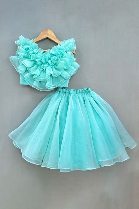 Aqua ruffle top featuring multi-layered and gathered overlap panels. Paired with a flared lehenga with an elasticated waistband and attached lining.