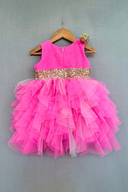 Pink Net, Cotton Sequins Ruffled Bow Dress