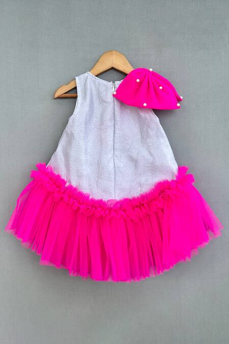 Silver textured dress featuring a pink frill hemline and pearl embellished shoulder bow
