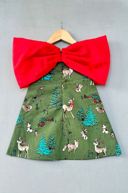 Green Cotton, Organza Bows Woodland Print Dress With Sequin