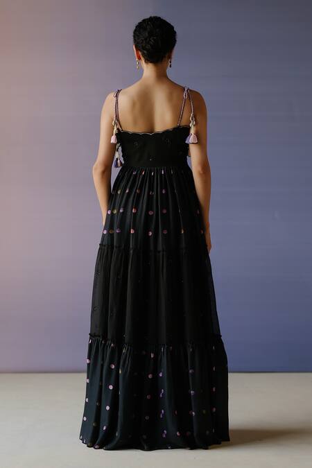 Black tiered dress featuring placed polka dot print and hand embroidery with tikki & resham