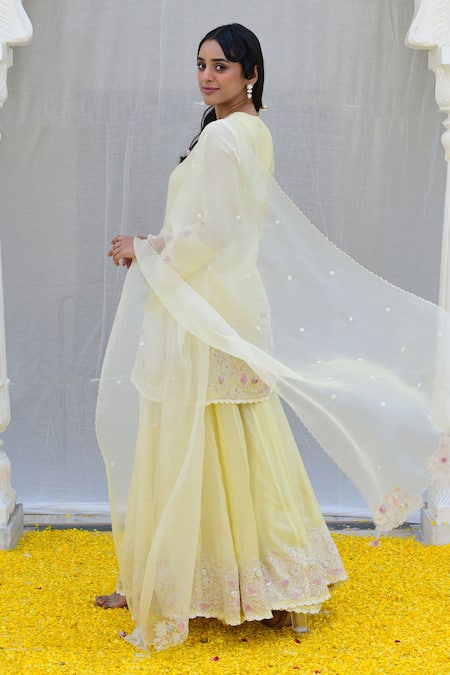 Lemon yellow kurta featuring intricate resham embroidery, applique florals, sequins, and organza 3D rosettes. Paired with an embroidered sharara and scallop dupatta.