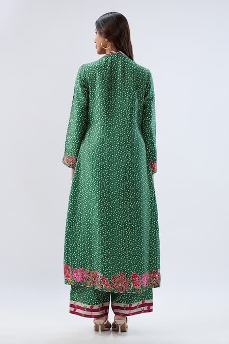 A dark green silk tencel kurta features a gathered yoke, a V-neckline, and a full-length silhouette with a printed pattern of small white dots. It is enhanced with beads, sequins, and thread embroidery at the yoke, sleeves, and hem. Paired with dark green straight pants featuring a coordinating printed pattern.