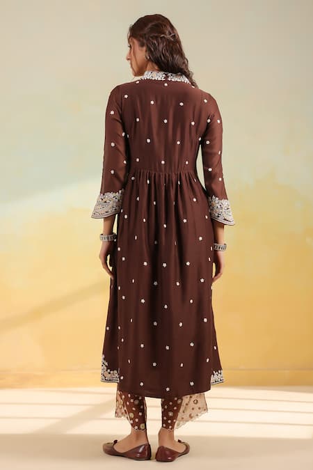 Buy_Label Niti Bothra_Brown Silk Embroidery V-neck, Collared Dori And Resham Frock Style Kurta Set _Online_at_Aza_Fashions