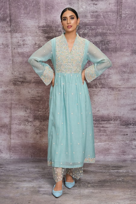 Light blue floral dori work kurta with resham detail. Paired with embroidered palazzo.