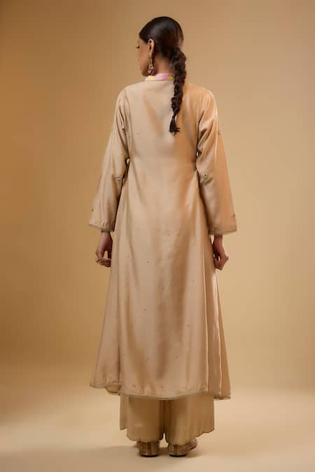 Ivory kurta featuring a striped yoke with embroidery and a front placket. Paired with matching ivory straight pants in Chiniya silk fabric.