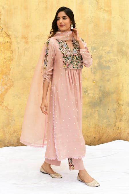 Pink Silk Embroidery Scoop Neck Floral Applique Kurta With Pant