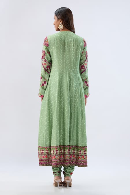 Green angrakha kurta in silk tencel fabric with a front wrap tie-up closure, enhanced with beads, sequins, and thread embroidery on the neckline, sleeves, and hem. It is paired with a matching printed churidaar and an embroidered silk organza dupatta with handmade tassels.