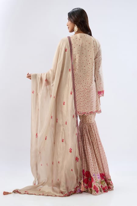 An ivory and pink Silk Chanderi kurta featuring beads, sequins, and thread embroidery at the neckline, sleeves, and hem in a scallop pattern. It is paired with a matching sharara enhanced with embroidery at the hem, and a printed embroidered Silk Organza dupatta with handmade tassels.