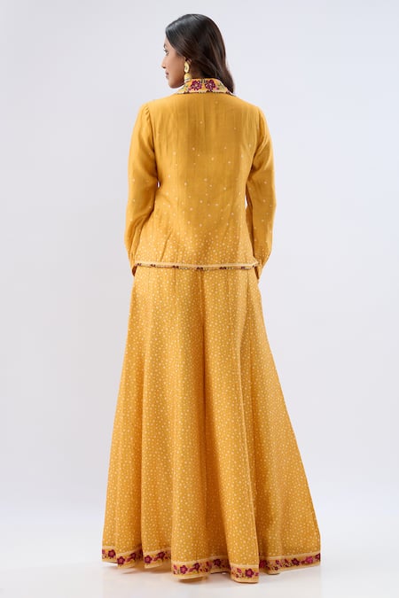 A yellow silk tencel shirt featuring a cross wrap front tie-up closure, full sleeves, and a collar, enhanced with beads, sequins, and thread embroidery on the collar, neckline, and sleeves. It is paired with flared panelled yellow printed sharara pants.