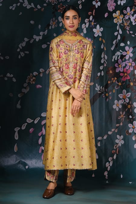 Yellow floral print kurta with embroidered detail. Paired with printed palazzo and dupatta.
