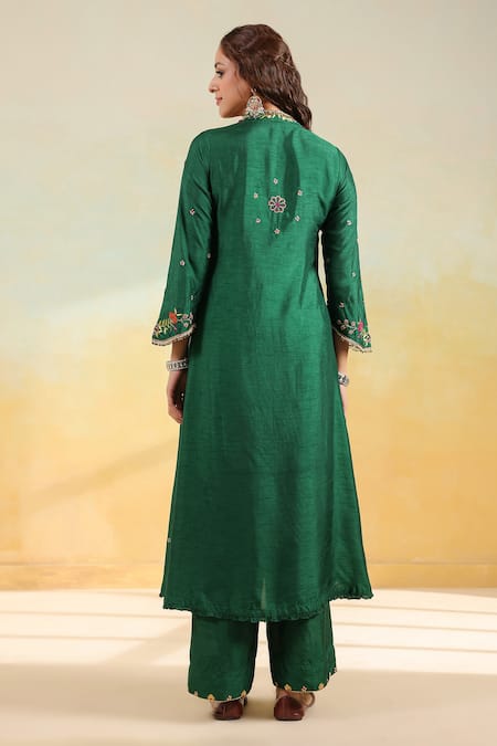 Green kurta set featuring delicate hand embroidery in silver resham threads gota patti and antique zardozi work on the neck and sleeves. Paired with matching pants adorned with gota patti and antique zardozi work.