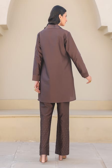 Buy_Label Niti Bothra_Brown Silk, Chanderi Embroidery Collared Tunic And Pant Set