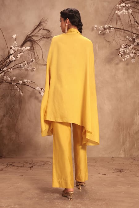 Dark yellow cape featuring placement embroidery at the sleeves. Paired with matching pants made from Chiniya silk.