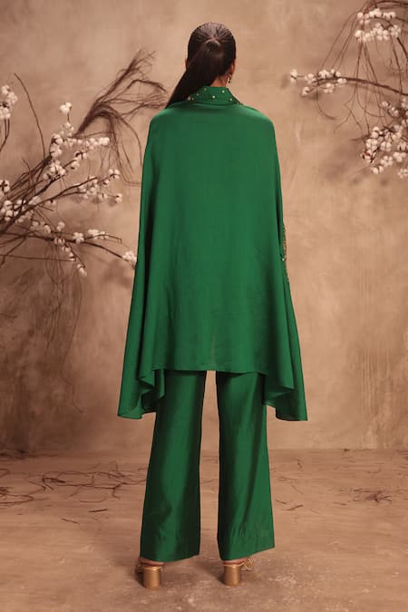 Green cape featuring placement embroidery and a front zipper. Paired with matching pant in Chiniya silk fabric.