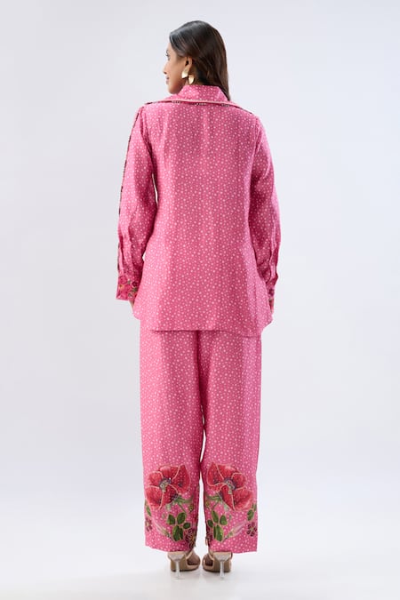 A pink silk tencel shirt featuring a polka dot print, collared neckline, front wrap tie-up closure, and beads, sequins, and thread embroidery on the collar and sleeves. It is paired with straight pants featuring a polka dot print and embroidery on the hem.