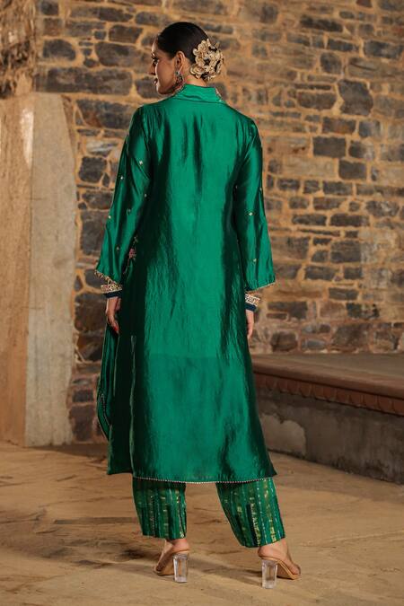 Green shirt style kurta featuring all over floral pattern with intricate cheent embroidery. Paired with zari stripe woven palazzo and embroidered side pockets.
