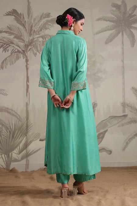 Buy_Label Niti Bothra_Green Silk Sequins, Beads Collared Roselyn Work Kurta And Palazzo Set _Online_at_Aza_Fashions